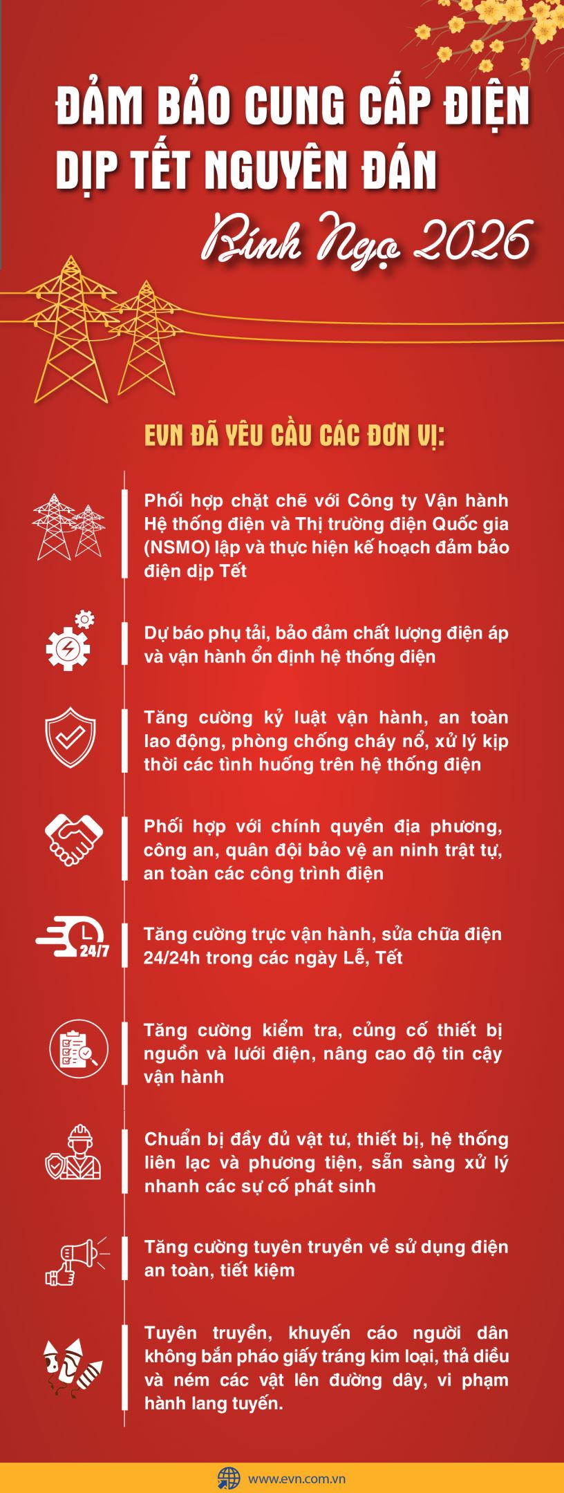 Nhằm đáp ứng nhu cầu sử dụng điện trong dịp Tết Nguyên đán Bính Ngọ, EVN kích hoạt đồng loạt nhiều giải pháp từ sớm - từ xa, bảo đảm hệ thống vận hành an toàn - ổn định, phục vụ tốt nhu cầu sinh hoạt và các hoạt động hoạt động sản xuất trên cả nước.