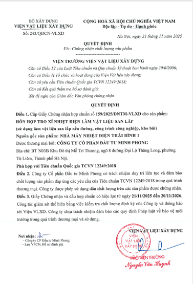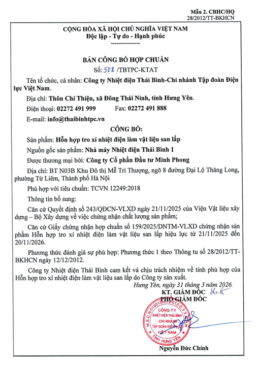 Công ty Nhiệt điện Thái Bình công bố Giấy chứng nhận hợp chuẩn: Hỗn hợp tro xỉ nhiệt điện làm vật liệu san lấp năm 2026
