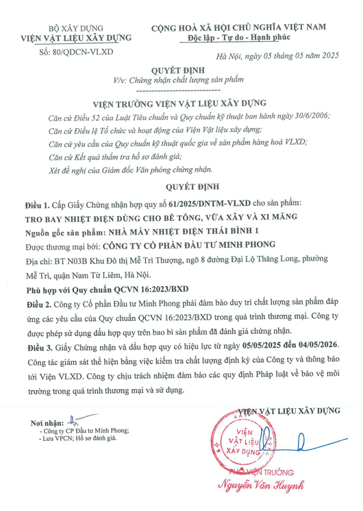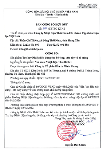 Công ty Nhiệt điện Thái Bình công bố Giấy chứng nhận hợp quy: Tro bay nhiệt điện dùng cho bê tông, vữa xây và xi măng năm 2026