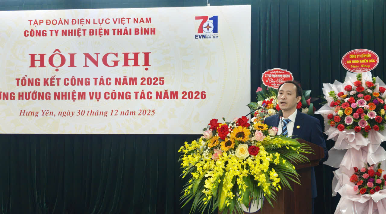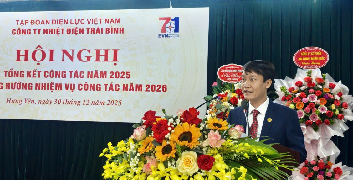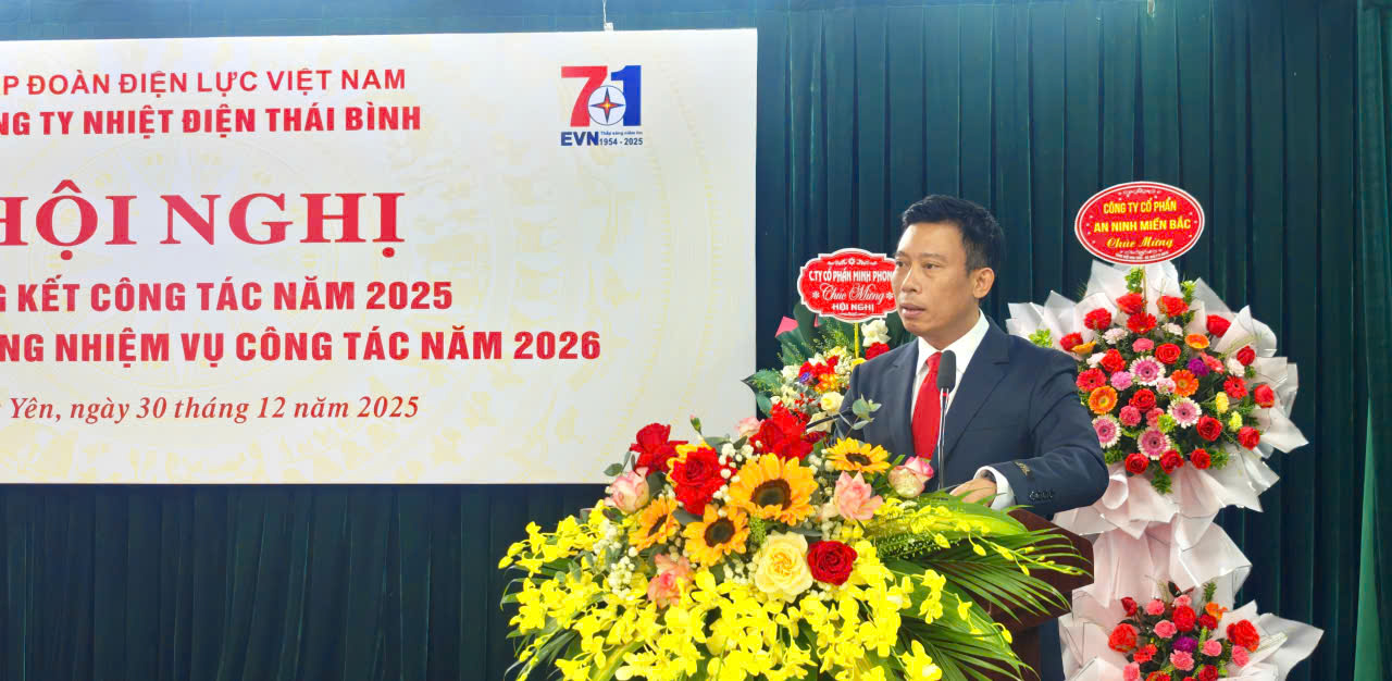 Phát biểu chỉ đạo tại Hội nghị, đồng chí Ngô Sơn Hải – Ủy viên BCH Đảng ủy, Phó Tổng Giám đốc Tập đoàn Điện lực Việt Nam ghi nhận và đánh giá cao những kết quả mà Đảng ủy và chuyên môn Công ty Nhiệt điện Thái Bình đã đạt được trong năm 2025. Đồng chí nhấn mạnh, trong bối cảnh điều kiện sản xuất kinh doanh còn nhiều khó khăn, đặc biệt là sức ép về đảm bảo vận hành an toàn, ổn định nguồn điện trong mùa cao điểm, tập thể cán bộ, đảng viên và NLĐ toàn Công ty đã nỗ lực vượt khó, phát huy tinh thần đoàn kết, đổi mới tư duy và phương thức làm việc, hoàn thành tốt các nhiệm vụ trọng tâm, góp phần duy trì sản lượng điện ổn định, tham gia đảm bảo an ninh năng lượng quốc gia và đáp ứng yêu cầu cung ứng điện phục vụ phát triển kinh tế - xã hội của tỉnh và khu vực.