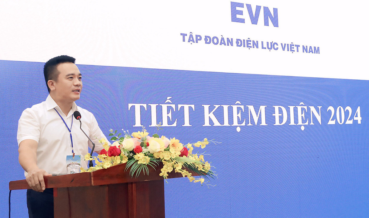 Phó Trưởng ban Kinh doanh EVN Trần Viết Nguyên trình bày tham luận về Chương trình tiết kiệm điện năm 2024 của EVN tại Hội nghị