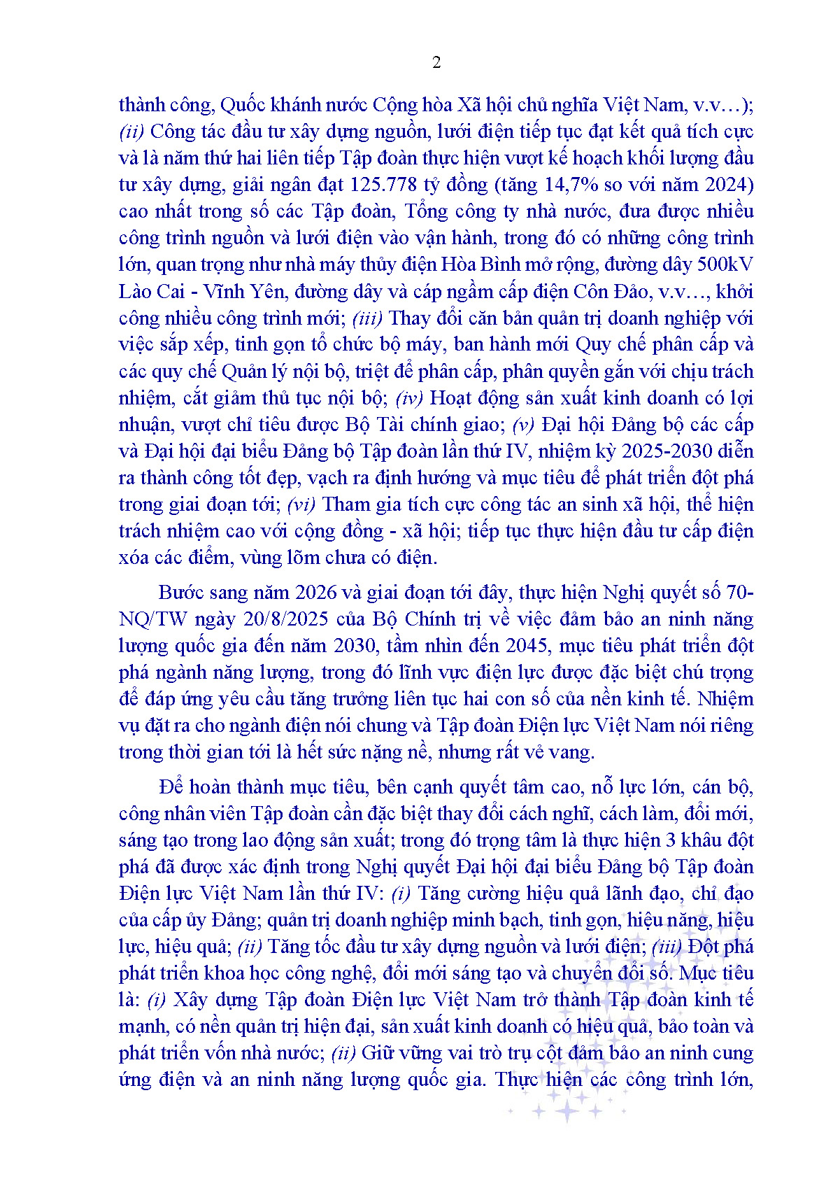 Nhân dịp kỷ niệm 71 năm Ngày truyền thống ngành Điện lực Việt Nam (21/12/1954 - 21/12/2025), đồng chí Đặng Hoàng An - Bí thư Đảng ủy, Chủ tịch HĐTV EVN gửi lời tri ân sâu sắc và chúc mừng tốt đẹp nhất tới các thế hệ lãnh đạo, cán bộ, công nhân viên, người lao động trong Tập đoàn Điện lực Việt Nam qua các thời kỳ!