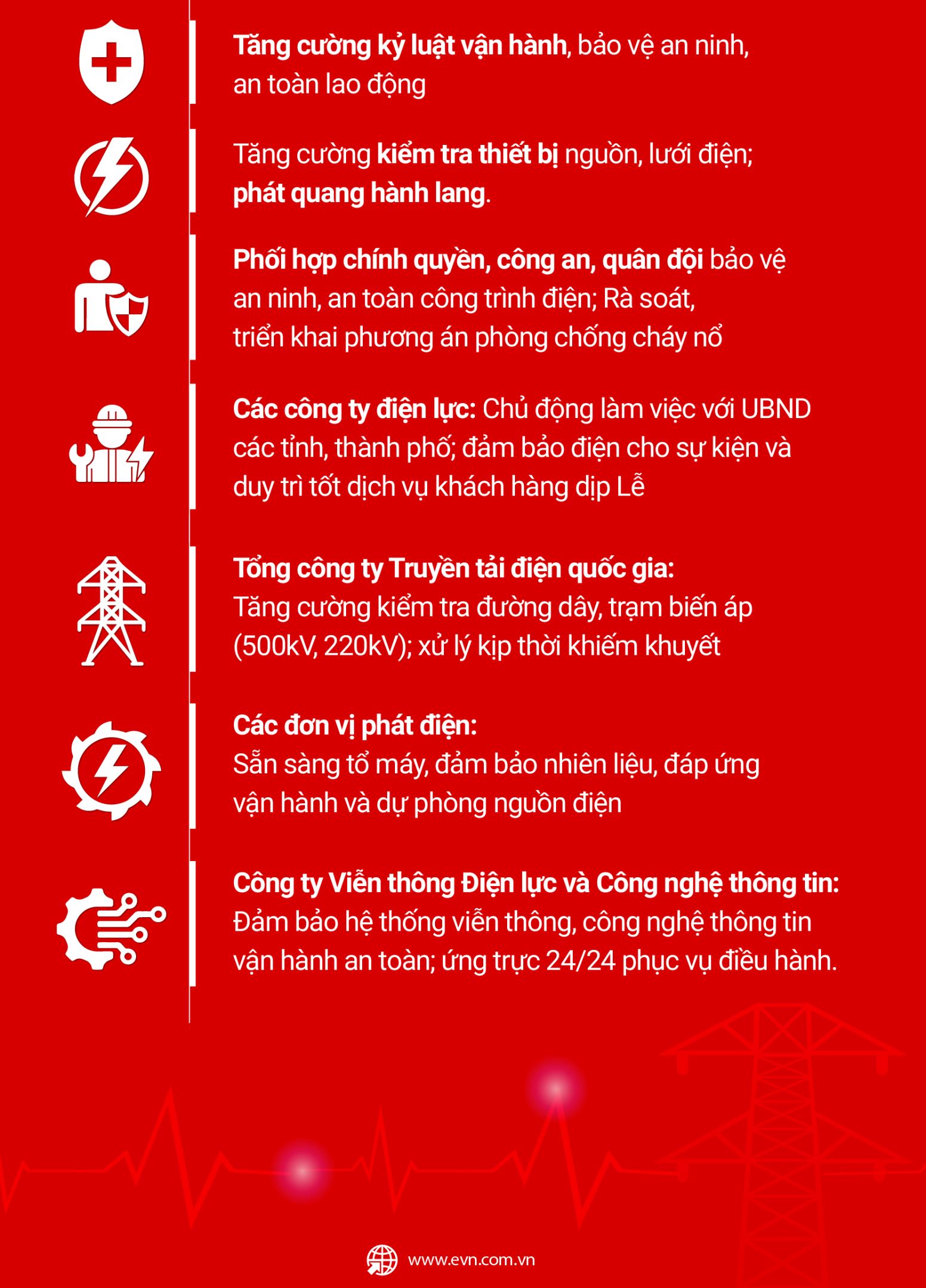 Để chuẩn bị cho dịp Lễ Giỗ Tổ Hùng Vương, Ngày Chiến thắng (30/4) và Ngày Quốc tế Lao động (01/5) năm 2026, Tập đoàn Điện lực Việt Nam (EVN) đã chỉ đạo các đơn vị triển khai đồng bộ các phương án, đảm bảo cung ứng điện an toàn, liên tục, ổn định phục vụ người dân trên cả nước.