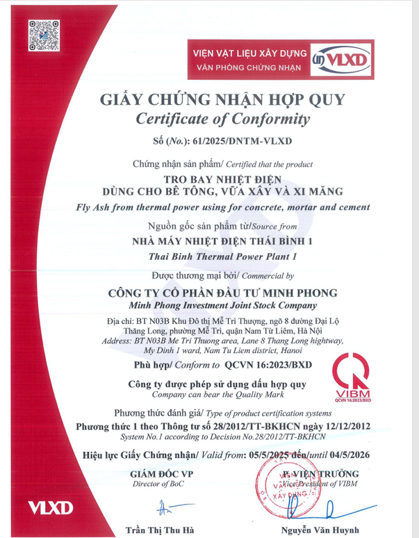Công ty Nhiệt điện Thái Bình công bố Giấy chứng nhận hợp quy: Tro bay nhiệt điện dùng cho bê tông, vữa xây và xi măng năm 2026