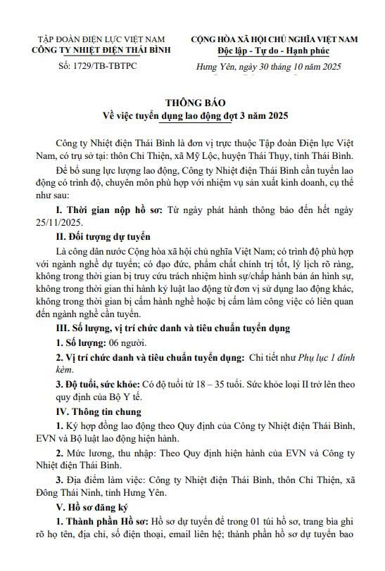 Công ty Nhiệt điện Thái Bình đã ban hành Thông báo số 1729/TB-TBTPC ngày 30/10/2025 về việc tuyển dụng lao động đợt 3 năm 2025. Căn cứ tình hình thực tế, Công ty Nhiệt điện Thái Bình thông báo thời gian nộp hồ sơ đến hết ngày 25/11/2025.