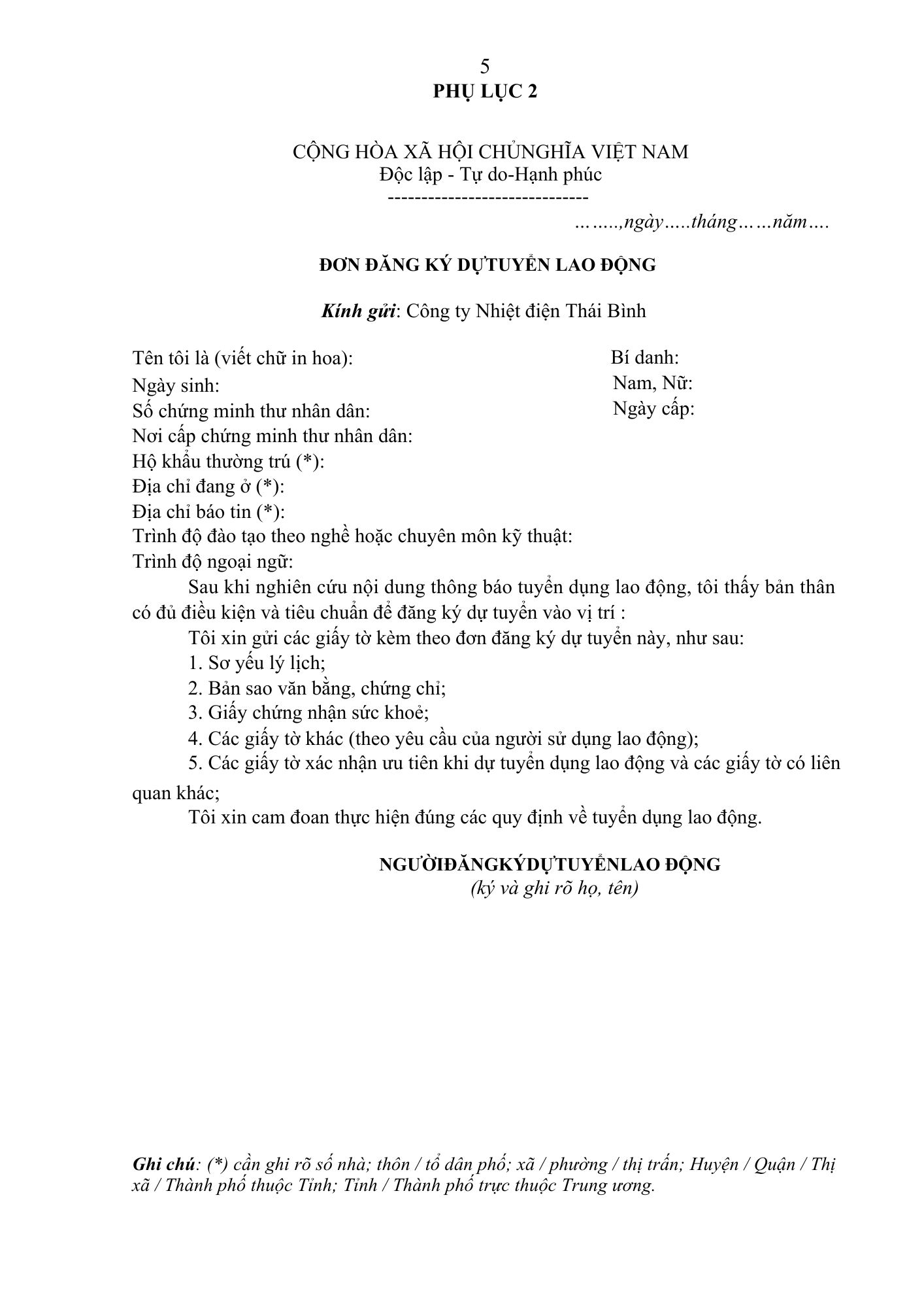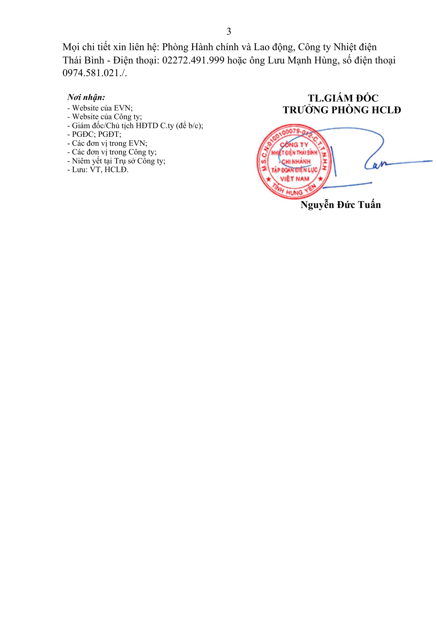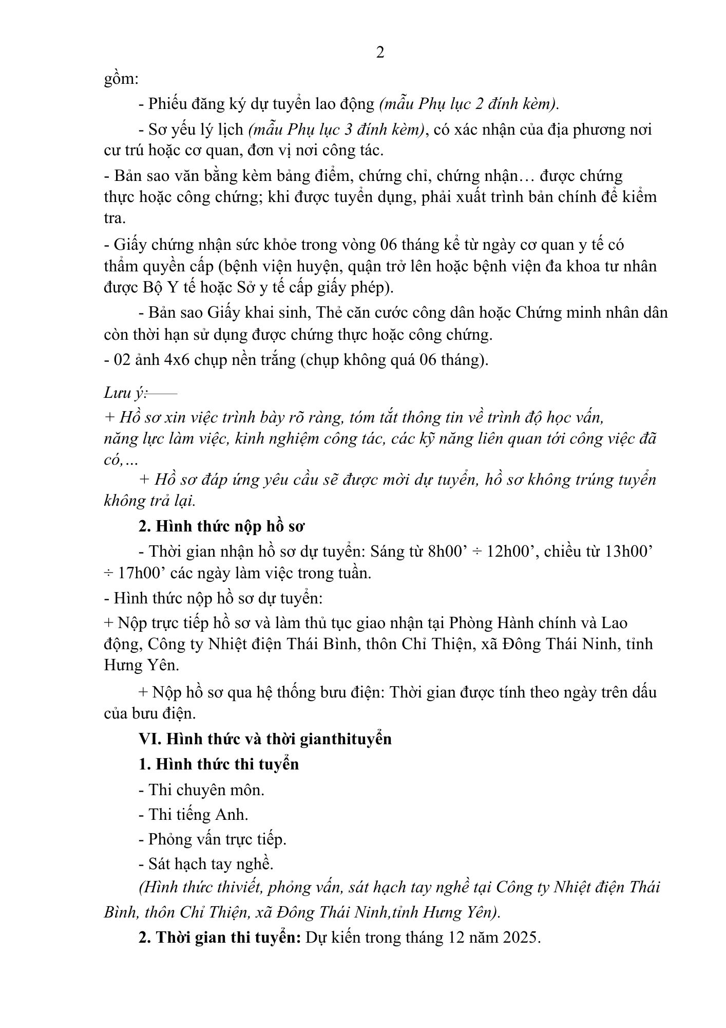 Để bổ sung lực lượng lao động, Công ty Nhiệt điện Thái Bình cần tuyển lao động có trình độ, chuyên môn phù hợp với nhiệm vụ sản xuất kinh doanh