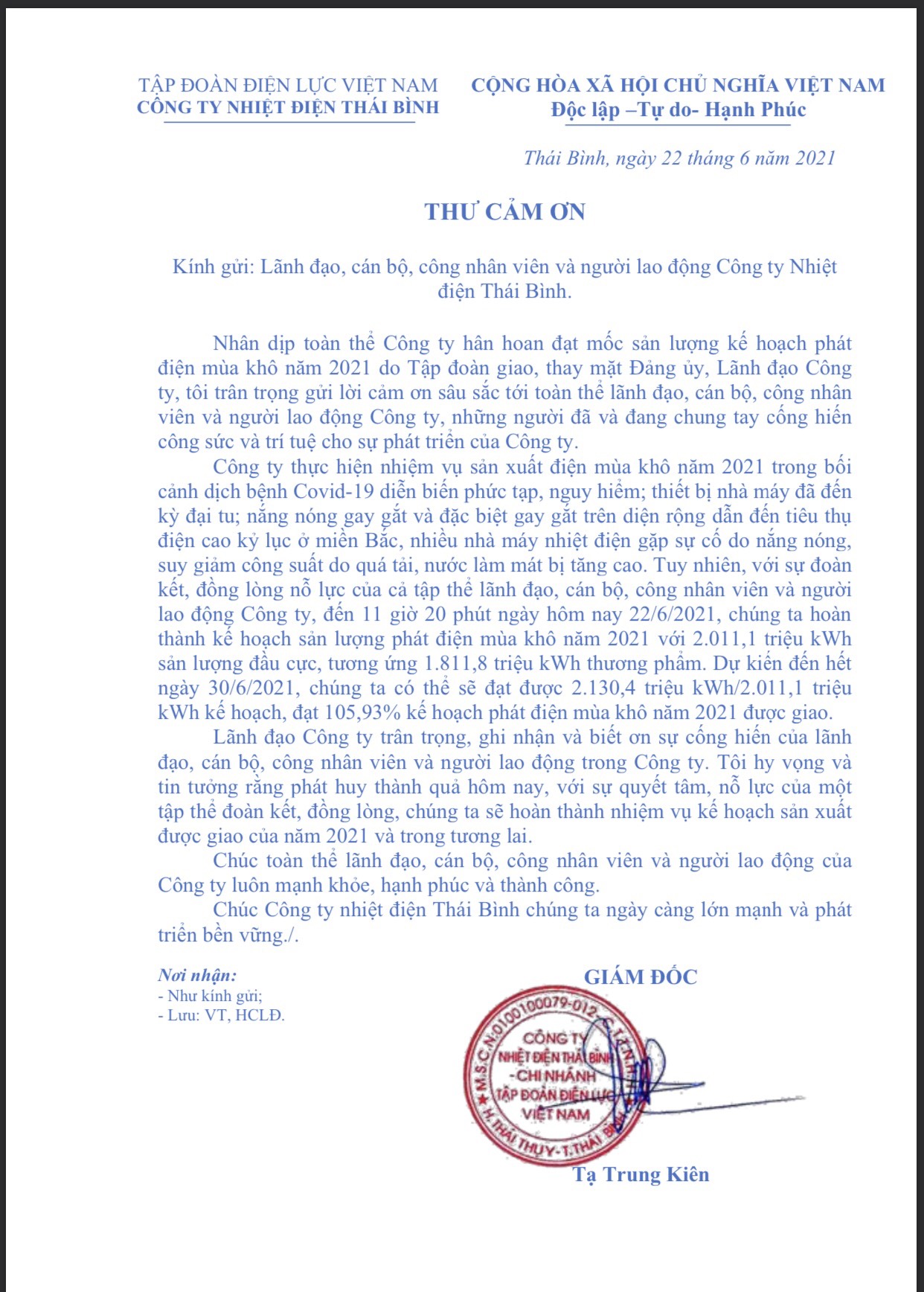 Thay mặt lãnh đạo Công ty, Giám đốc Công ty gửi thư cảm ơn toàn thể CBCNV Công ty đã chung sức đồng lòng, nỗ lực hoàn thành chỉ tiêu sản lượng và đã có quyết đinh thưởng cho CBCNV nhân dịp hoàn thành chỉ tiêu 6 tháng đầu năm.